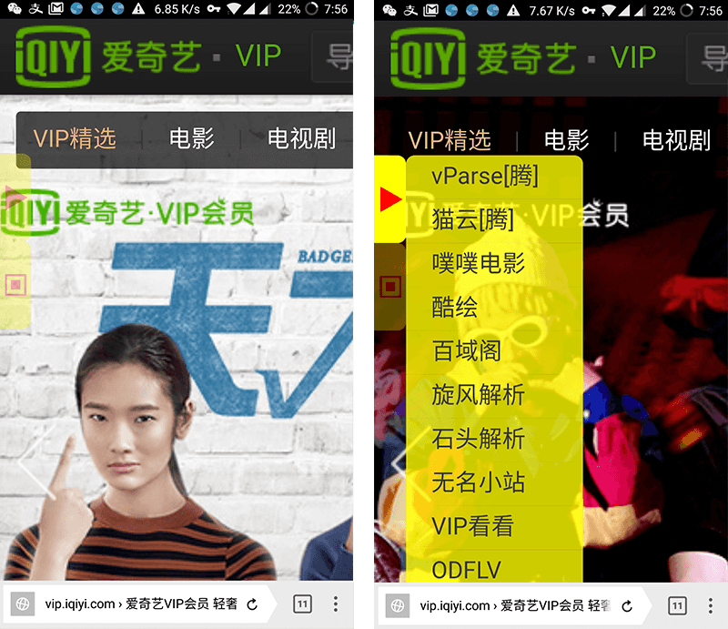 打开想要观看的视频网站,在播放页面给浏览器选『网站完整版』,然后点击屏幕左侧黄色小三角,将会跳转到解析页面观看。(优酷比较特殊,需要进入网站就开启网站完整版)