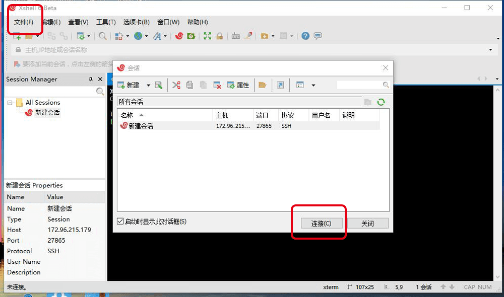 点击连接,如果Xshell没有弹出对话框,请再次点击左上角的文件,选择打开,选择刚才新建的登陆信息,点击连接。