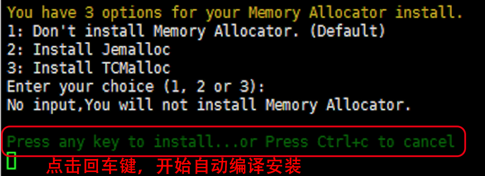 按回车键确认开始安装。 LNMP脚本就会自动安装编译Nginx、MySQL、PHP、phpMyAdmin、Zend Optimizer这几个软件。