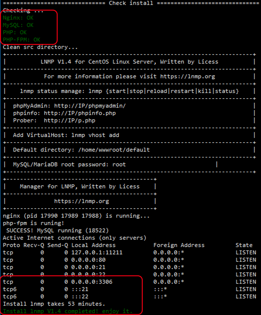 如果显示Nginx: OK,MySQL: OK,PHP: OK,并且Nginx、MySQL、PHP都是 running,80和3306端口都存在,并提示安装使用的时间及Install lnmp V1.4 completed! enjoy it.的话,说明已经安装成功。