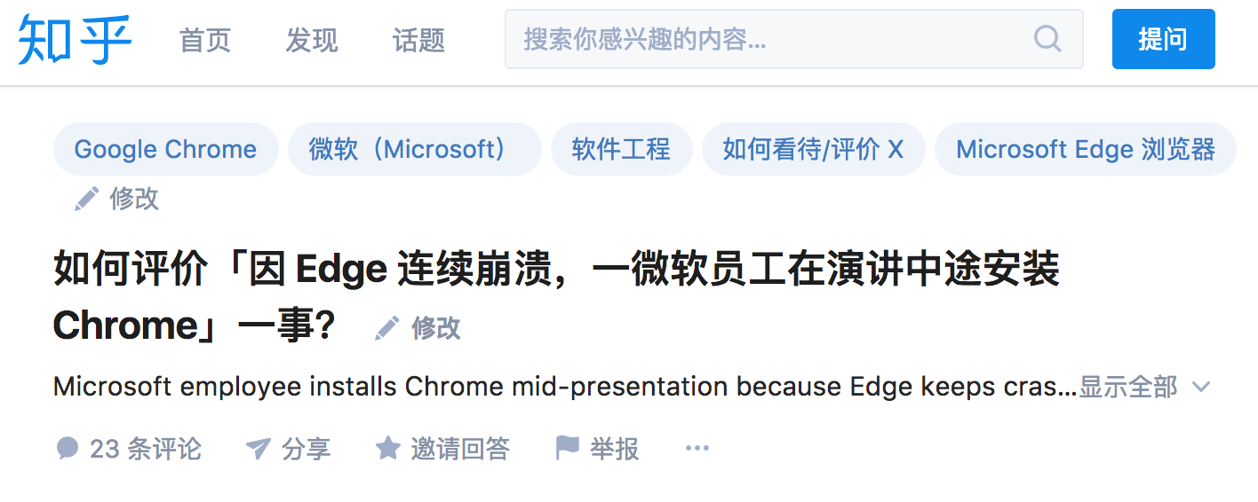 这么讲吧,前几天还有一个新闻讲到,微软的一名员工在对外演讲过程中,遇到了微软自家的浏览器崩溃问题,一度无法开展演讲展示,最后只能下载了竞争对手 Google 家的 Chrome 浏览。