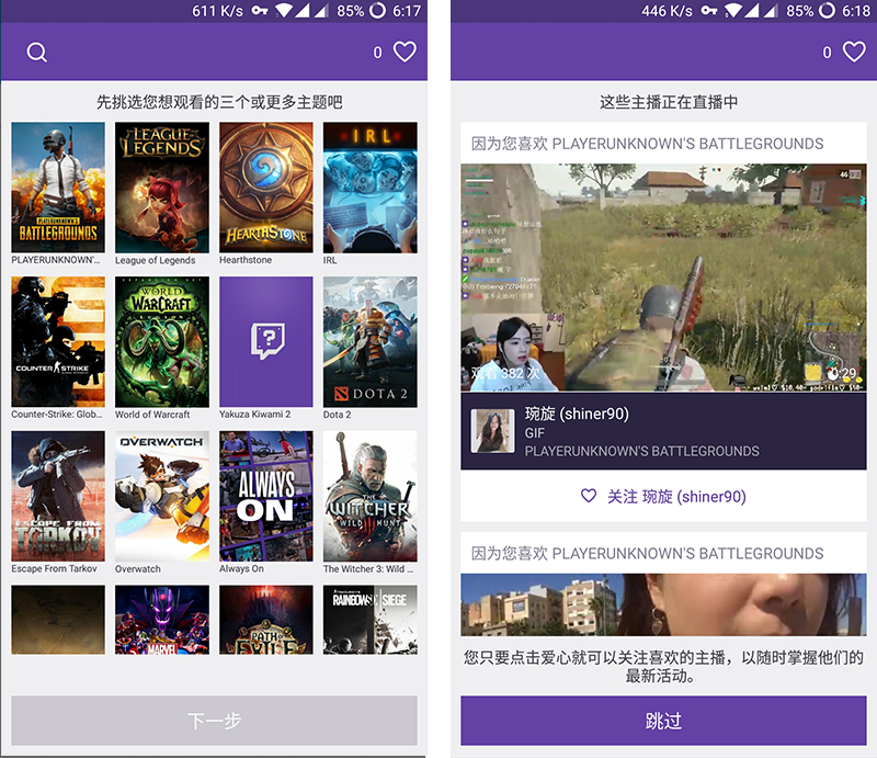登陆账号,会先让你挑选一些感兴趣的游戏,选择相关游戏后,会推荐相应的著名主播关注