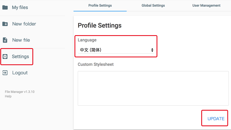 进入网盘,点击左侧的『Settings』进入设置页面,然后选择『简体中文』 ,并点击右下角第一个『UPDATE』 按钮更新。