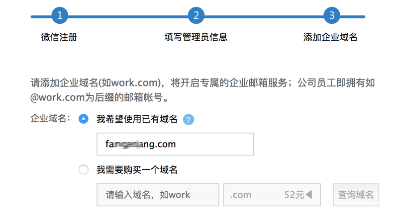 申请腾讯企业邮箱,首先你要有一个域名,可以选购一个你的名字拼音缩写,或其他你认为有意义的内容※[购买域名]