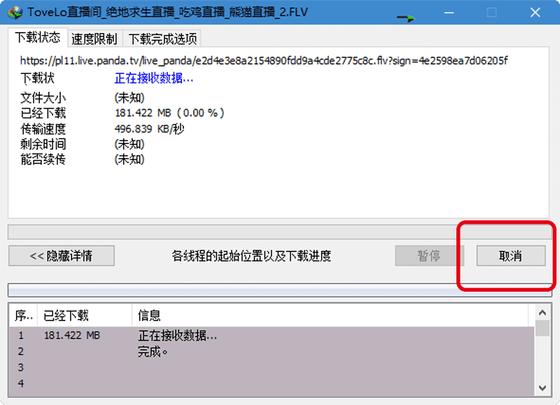 点击下载对话框的取消按钮,即可停止对直播的下载。