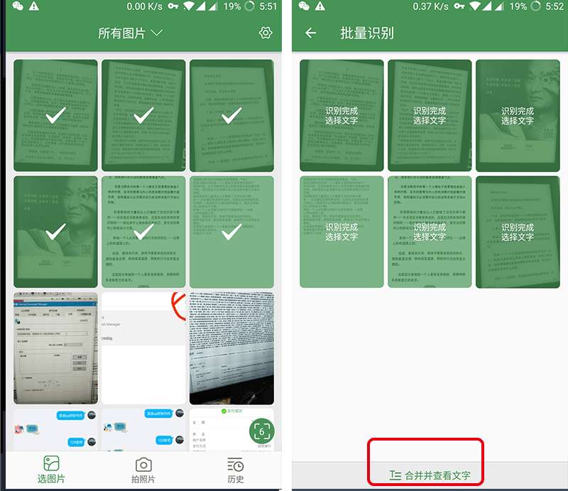 白描支持批量识别,可以一次选择多张图片,同时进行文字识别,识别后的文字可以单独查看或者合并。