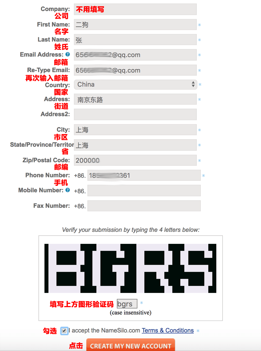 打开Namesilo官网[点我前往],打开账号注册页面,按照图片填写并勾选