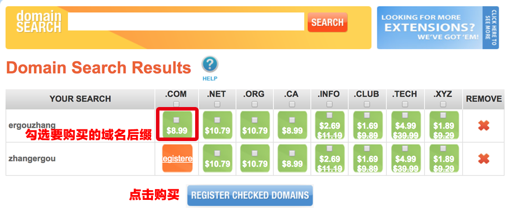 选中你要购买的域名后缀,比如 ergouzhang.com、ergouzhang.net、ergouzhang.org 任意一个都可以,一般我们会优先选择 .com 的后缀域名。
