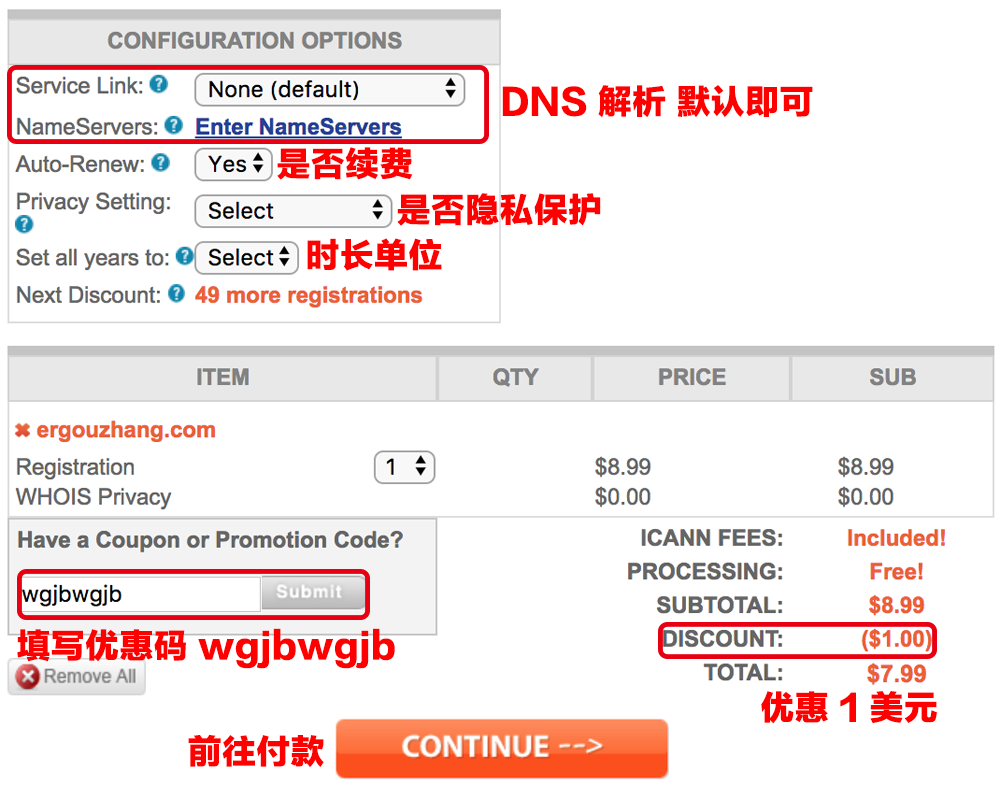 其次都一次购买域名时填写优惠码 [wgjbwgjb ],可以减免1美元。如果你要购买多个域名,请分开购买,因为你多个域名一起购买时也只能减免1美元。我第一次购买时,一次性买了3个,只减免了1美元有点傻逼了。