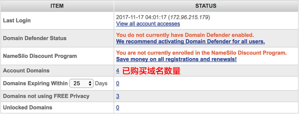 点击官网最上方的[点我前往] My Account,可以看到已购买域名数量。点击购买数量,查看域名详情。