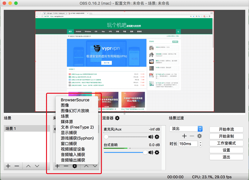 可以看到正在捕获的内容正是我打开的浏览器窗口。重点来了,如果你还打开了网易云音乐并移动到了网页上方,OBS 并不会把网易云音乐窗口录制进去!