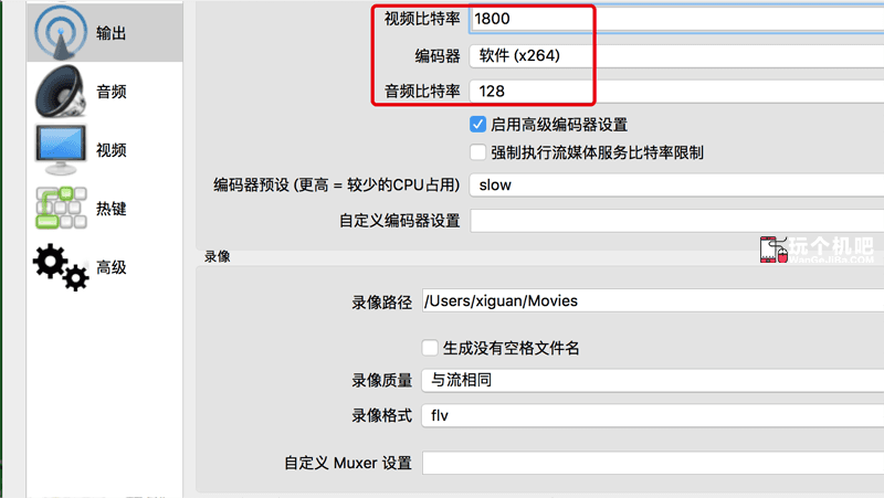 3.视频/音频比特率,比特率是指每秒传送的比特(bit)数,比特率的大小决定了固定时间内的视频体积,假如视频比特率为 1800Kbps,录制10分钟将会得到体积大小为 10*60*1800Kbps/8/1024=131M 的视频。比特率选择多少同样要看被录制的内容和要发布的平台,比如 B站最高支持1800KB的视频。