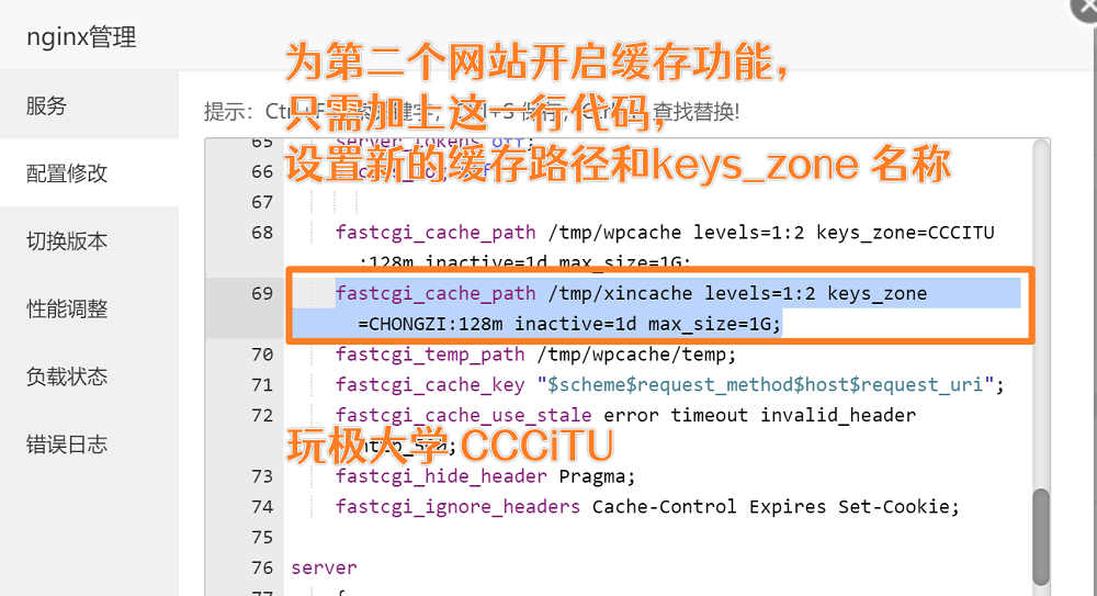 就在已添加的 Nginx 配置基础上,再加一行代码,为第二个网站设置不同的 fastcgi_cache_path 路径和 keys_zone 名称(大写),比如,可将第二个网站 fastcgi_cache_path 设置为 /tmp/wpcache2 将 keys_zone 设置为 CHONGZI