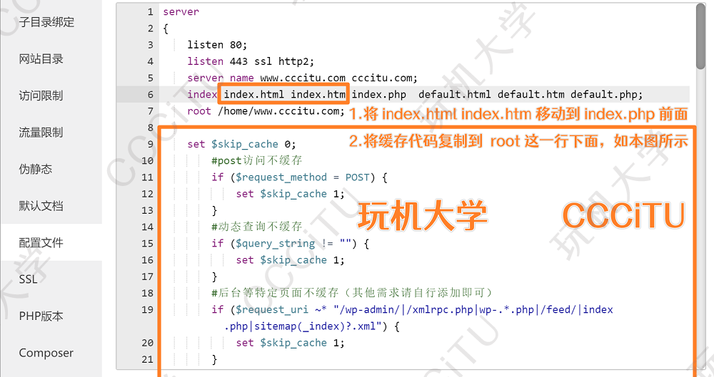 首先,打开站点的配置文件,先将如上图所示的index.html index.htm移动到index.php的前面。