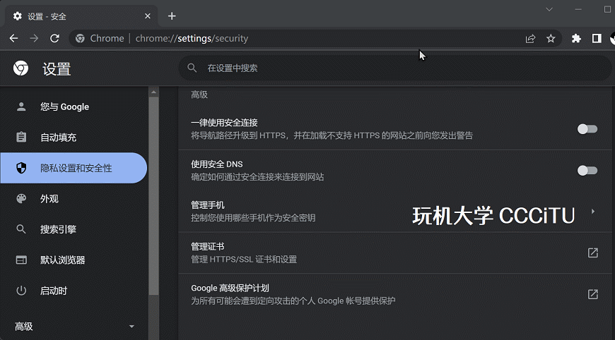 Chrome 谷歌浏览器地址栏打开 chrome://settings/security ➡️点击使用安全 DNS➡️选择内置 DNS 或自定义添加 DNS。