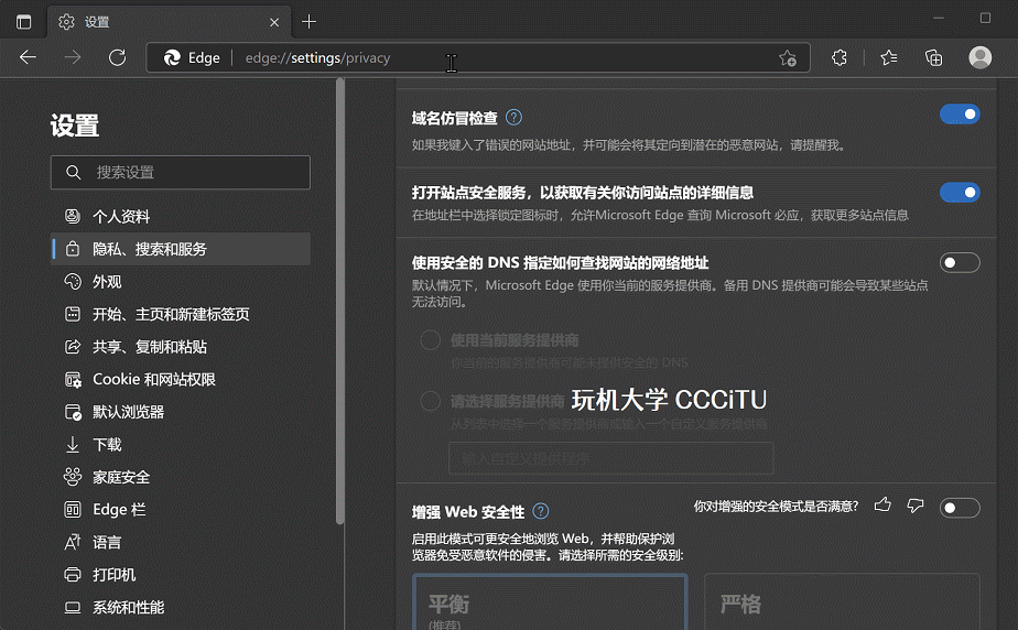 Edge 微软浏览器地址栏打开edge://settings/privacy➡️点击使用安全的 DNS 指定如何查找网站的网络地址➡️请选择服务提供商➡️使用默认 DNS 或自定义添加 DNS