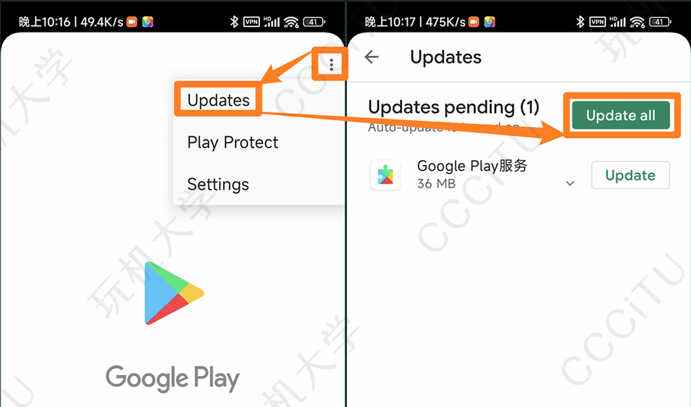 👆先连接留学工具➡️再打开 Google Play➡️右上角菜单 Updates➡️Updates all