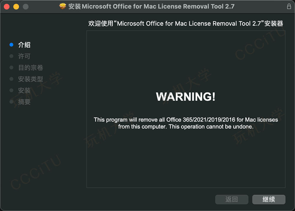 如何删除 Mac 上的 Microsoft Office 许可证文件 Mac编辑于:2023年06月05日 分享 如果 MAC 上的 Word、Excel、PPT 许可证过期但在重新激活时报错,以及想要更改产品激活信息中显示的属于邮箱,都可以先删除曾经安装的 Microsoft Office 许可证文件。 删除步骤 对于非 Microsoft 365 订阅许可证,可以采用如下步骤: 1.首先 下载 官方许可证删除工具。 2.从 Mac 的打开下载的.pkg文件。 3.根据设置向导,一步一步操作即可,执行到最后一步,就彻底删除了。 文章来源: 如何删除 Mac 上的 Microsoft Office 许可证文件 标签:Microsoft Office · Office · Office 许可证 生成海报 点赞 0 分享