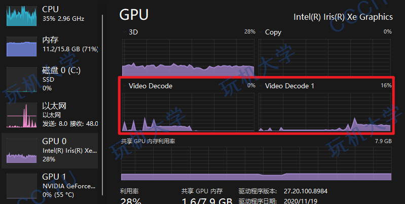 那么打开电脑任务管理器,如果 GPU 的Video Decode有占用,说明就是硬解了。