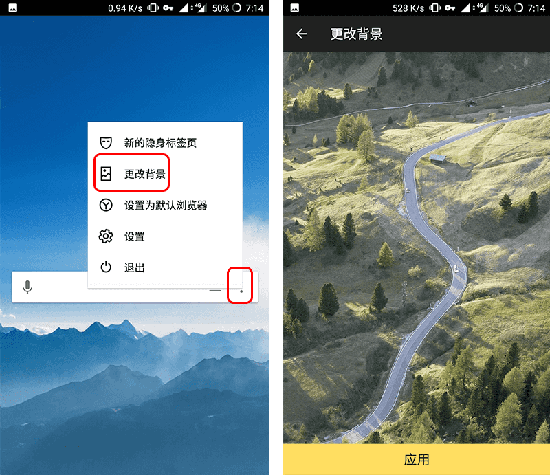 最后是背景,点击地址栏最右侧的三个点,选择更改背景,会打开在线图库,选择喜欢的背景图应用即可。图库如果打不开出现连接故障[为什么],请安装虚拟专用网络或网络代理工具。