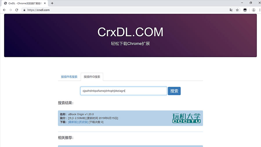 我们以非常著名的广告屏蔽插件uBlock Origin为例。打开Chrome扩展插件离线包下载网站CrxDL选择按插件ID或者插件名称的方式搜索下载。