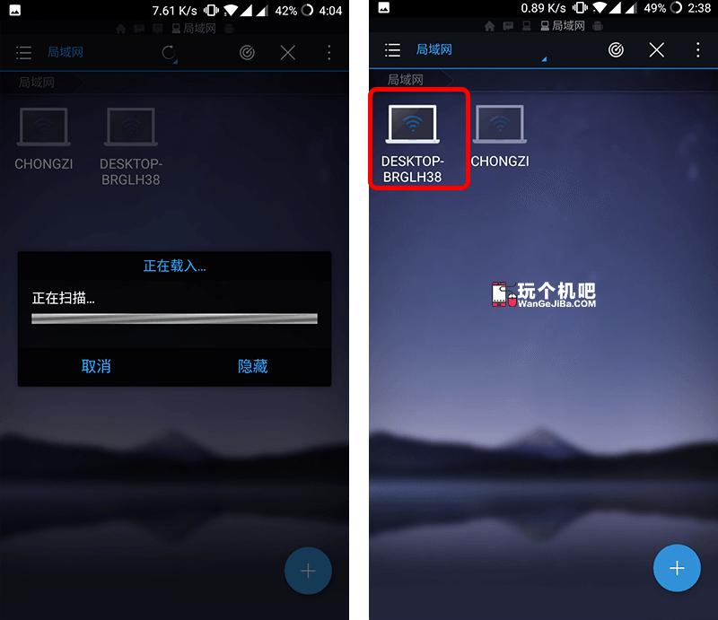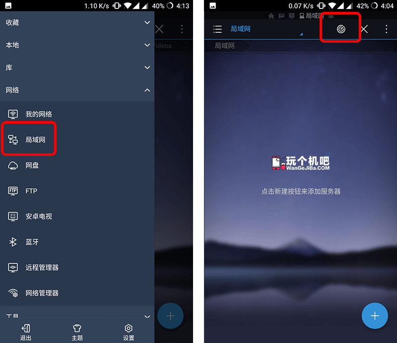 启动ES文件浏览器,选择“局域网”,点击右上角雷达图标,开始搜索处于同网络的设备。