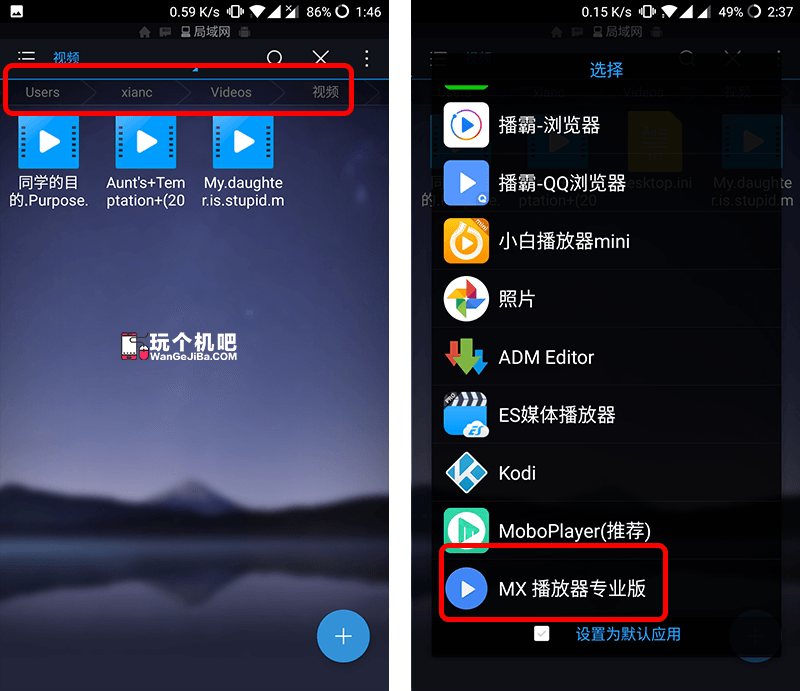 打开“视频”文件夹(在上方可看到ES打开的文件目录和电脑分享时显示的目录一致),点击其中一个视频,ES会询问你使用什么APP播放这个视频,选择“MX”播放器