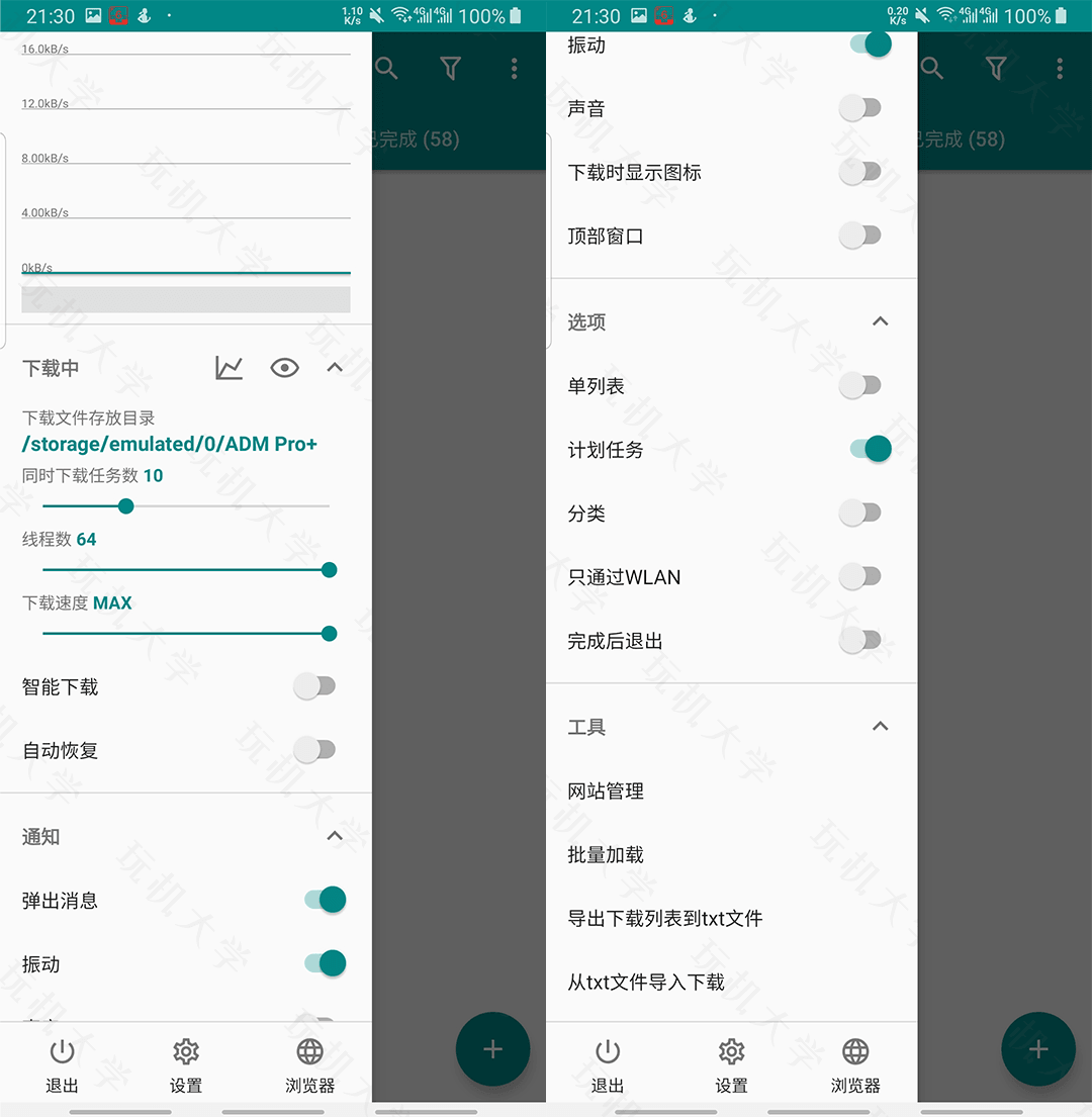 魔改版 ADM Pro 最高支持 64 线程,点击左上角菜单图标,将下载线程数设置为 32 一般就足够了。此外,还可以根据需要设置同时下载任务数、下载限速等功能,以及根据需要使用批量导入、定时下载等高级功能。