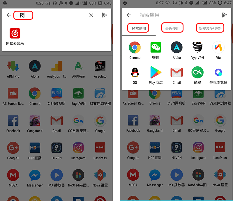 根据使用习惯动态生成的『经常使用』『最近使用』『新按照/已更新』分类,多数时候都不需要你去输入字母或汉字搜索应用,即可找到你要启动的应用。