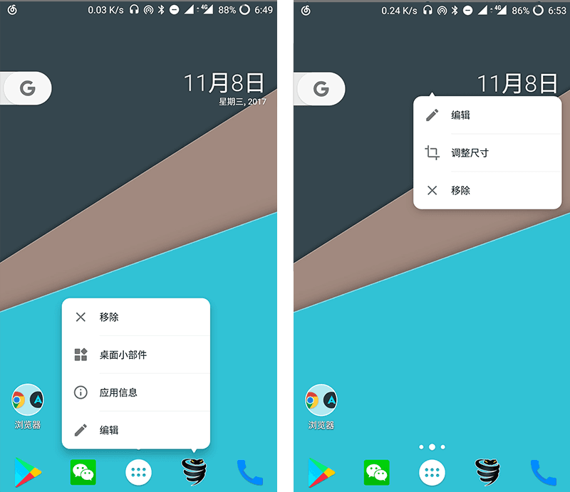 在桌面长按APP 图标即可移除、添加桌面小部件、打开应用信息或者编辑该 APP 的名字和更换图标。如果安装了 NoShadow ,在更换图标时可调用 NoShadow 图标库已有的图标。
