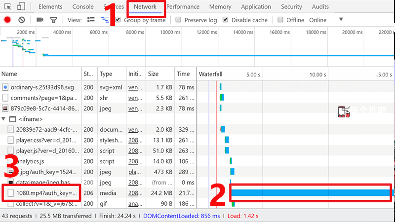 先点击最上方“Network”,再刷新网页开始播放视频,接着观察下方蓝色加载条,最长的那个一般是视频下载文件,双击文件打开。