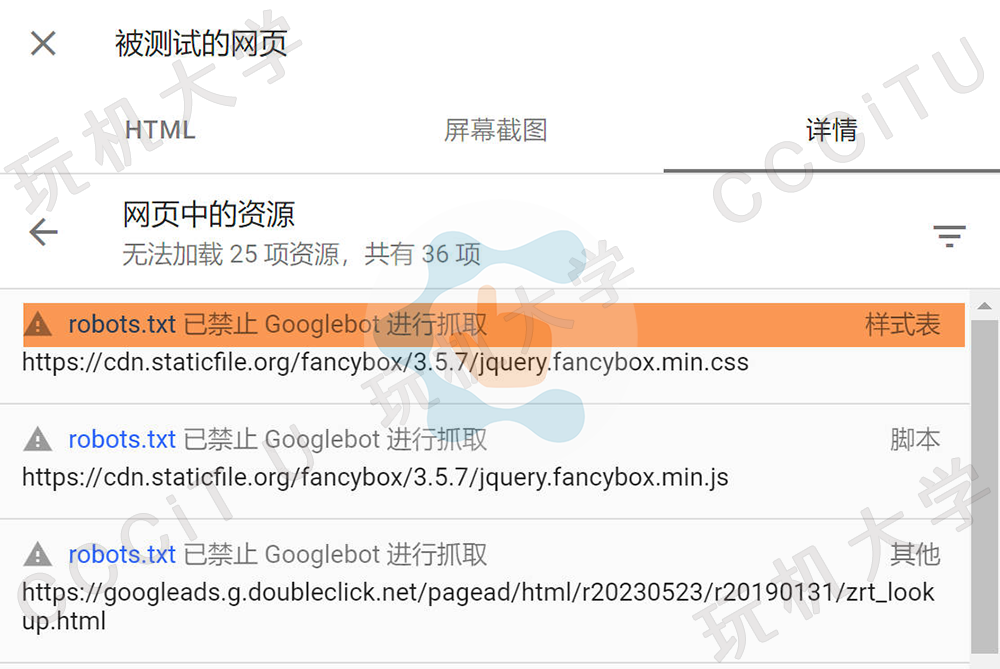 比如谷歌站长平台有一项移动设备易用性检查,当阻止 JS/CSS 的抓取后,会提示“网页在移动设备上未通过易用性检查,存在这些问题的网页无法提供良好的网页体验”,这必然会影响网站的排名。