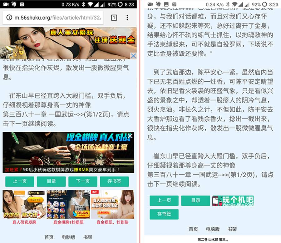 如虫子通过百度搜索小说《剑来》进入网站阅读,经过夸克内置广告规则的屏蔽,干净的页面使得阅读体验非常好。而同样的网址由Chrome浏览器打开,则满屏低俗广告,很难叉掉且极易误触。