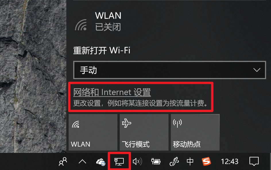 先打开电脑右下角网络图标(网线连接图标是电脑,wifi 连接图标是电波),点击“网络和 Internet 设置”选项。
