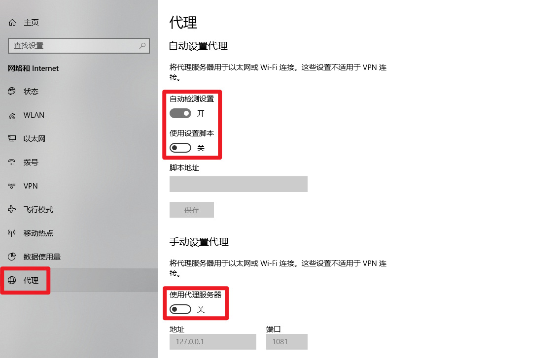 点击“代理”选项,打开“自动检测设置”,关闭“使用设置脚本”和“手动设置代理”选项。