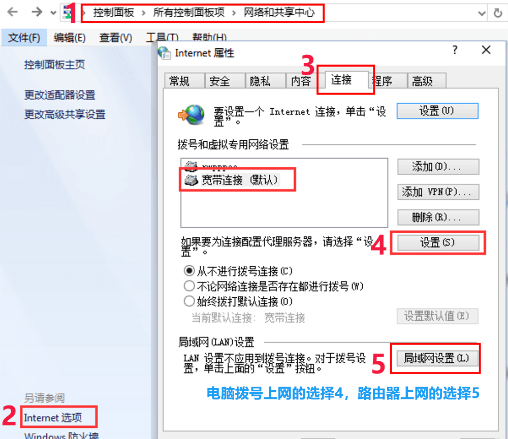 如果是电脑拨号上网,则选择“宽带连接—设置”;如果是通过路由器直接上网,则点击“局域网设置”