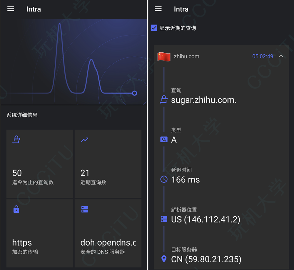 Intra 还非常贴心的提供了 DNS 数据统计功能,网上滑动页面,下方会提供查询次数、传输方式和所用 DSN 服务器。