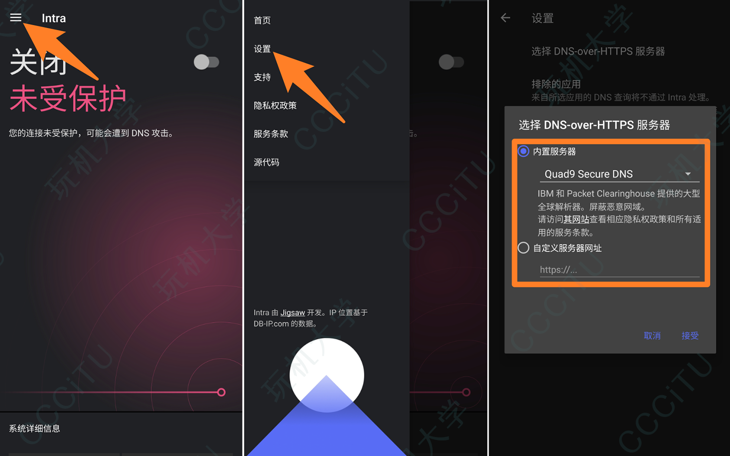 先 下载Intra 安装,点击右上角菜单图标➡️设置➡️选择 DNS-over-HTTPS➡️选择内置服务器挑选自带的DNS➡️或自定义服务器网址。