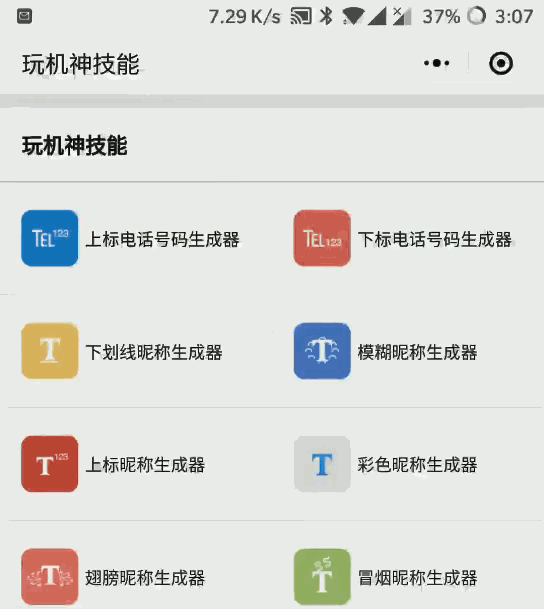 虫子曾分享过类似的微信昵称装逼功能《装逼指南:如何优雅地美化微信昵称》,如今我们把该功能进行了优化和升级,制作了一个更强大的微信小程序:玩机神技能。