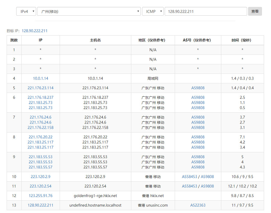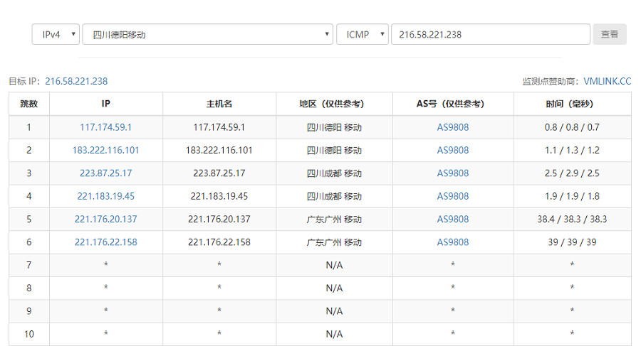 如上图所示,从四川德阳移动访问Google服务器位于香港的某个IP时,网络请求从四川德阳移动中转到广东广州移动,最终消失在了221.176.22.158节点。说明是这个广州移动的221.176.22.158节点拦截了该请求。