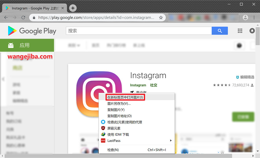 以 Instagram 为例,打开网页版 Google Play 搜索 Instagram,右键点击 Instagram 图标选择新窗口打开图片