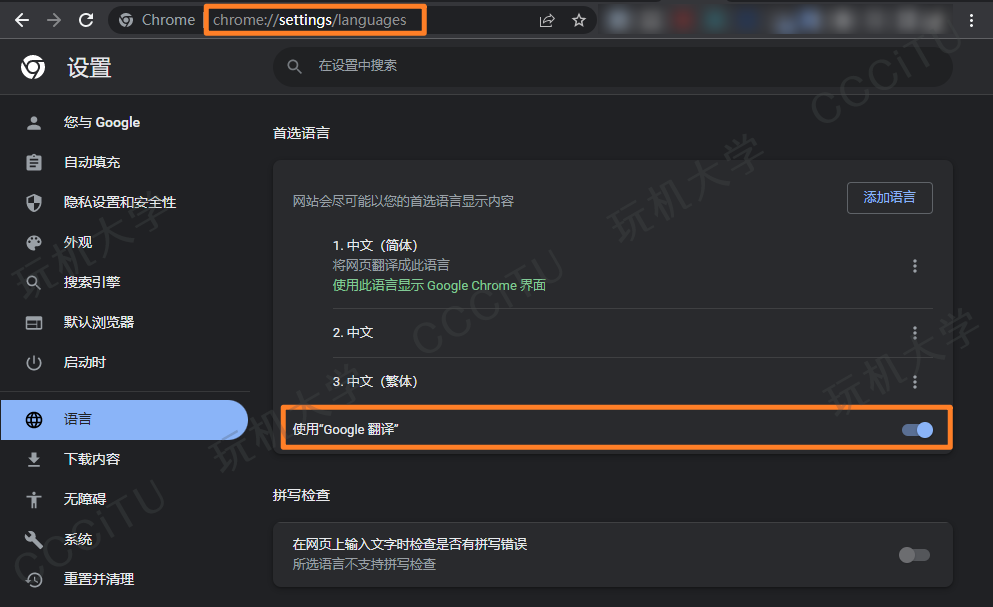 在 Chrome 浏览器地址栏打开chrome://settings/languages勾选使用“Google 翻译”