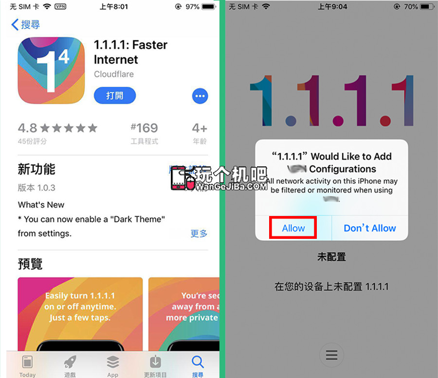 1.1.1.1 APP使用方法非常简单,安装打开安卓或iOS 客户端(iOS需海外苹果ID),点击屏幕中间的开关启用即可。iOS用户需注意,初次使用时会提示安装配置文件,要在提示框选择Allow