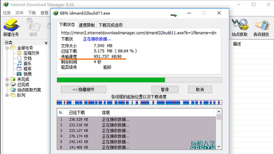 将IDM的线程数设置为32,在同一台电脑和同样的网络环境中,下载速度将近900KB每秒,是Chrome的45倍。