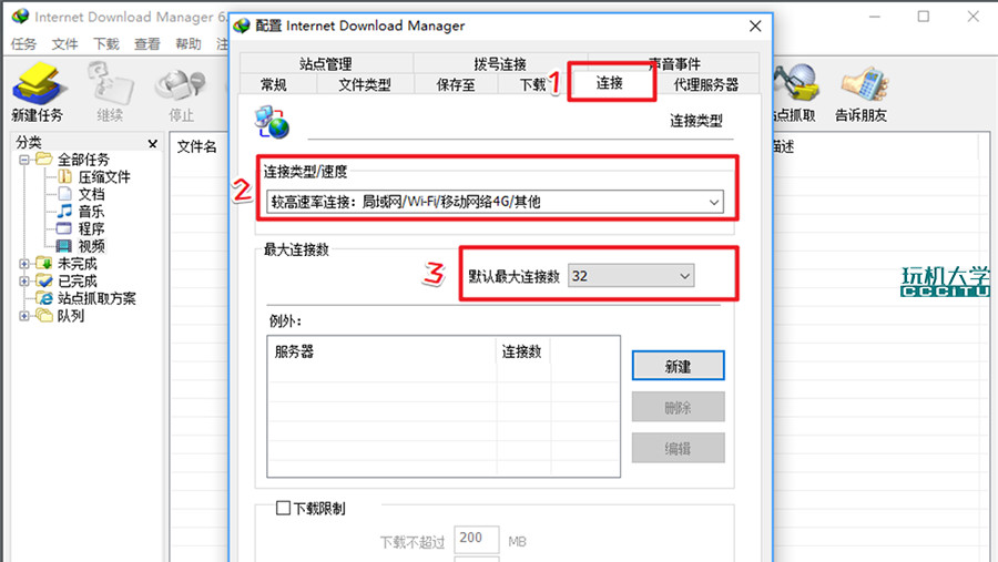打开IDM程序——选项——连接——连接类型(较高速率)——最大连接数(32)