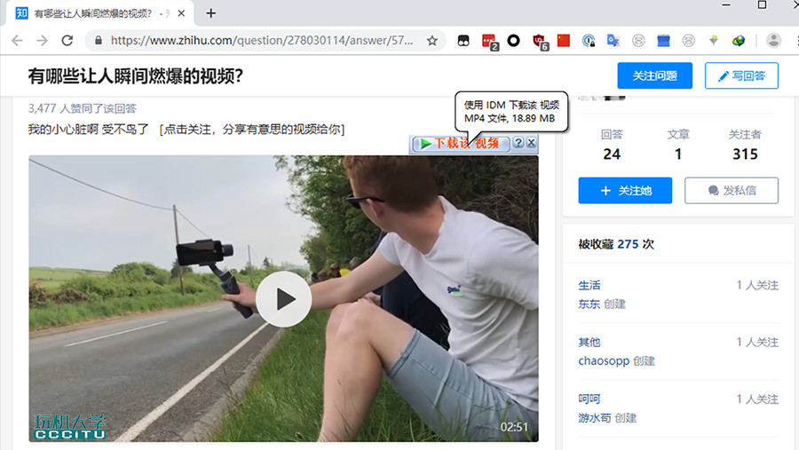 如果是下载可在国内访问的,类似天空之城、知乎等网站的视频,直接点击视频右上角悬浮的IDM下载框。