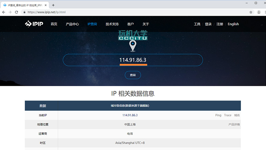 打开https://www.ipip.net/ip.html获取你宽带的出口IP,图例IP是114.91.86.3