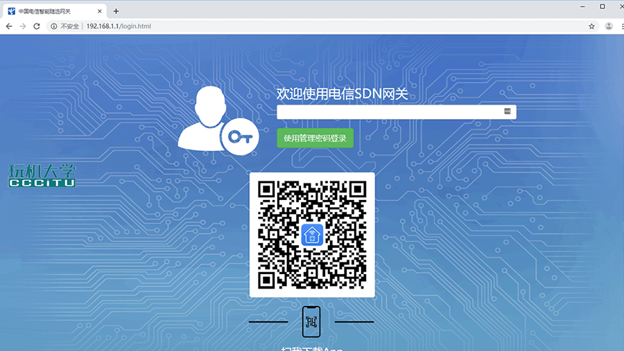 浏览器打开http://192.168.1.1进入SDN光猫后台页面,手机扫描安装APP以备后用(光猫的所有的功能只能在APP里设置)。