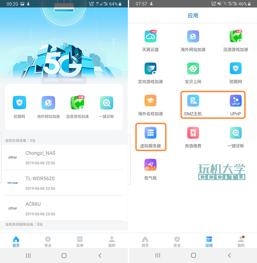 打开SDN光猫管理APP网络管家,按照提示绑定SDN光猫完成登陆。点击应用,可以看到DMA/UPnP和虚拟服务器(也叫端口转发)这三个选择都能实现外网访问。