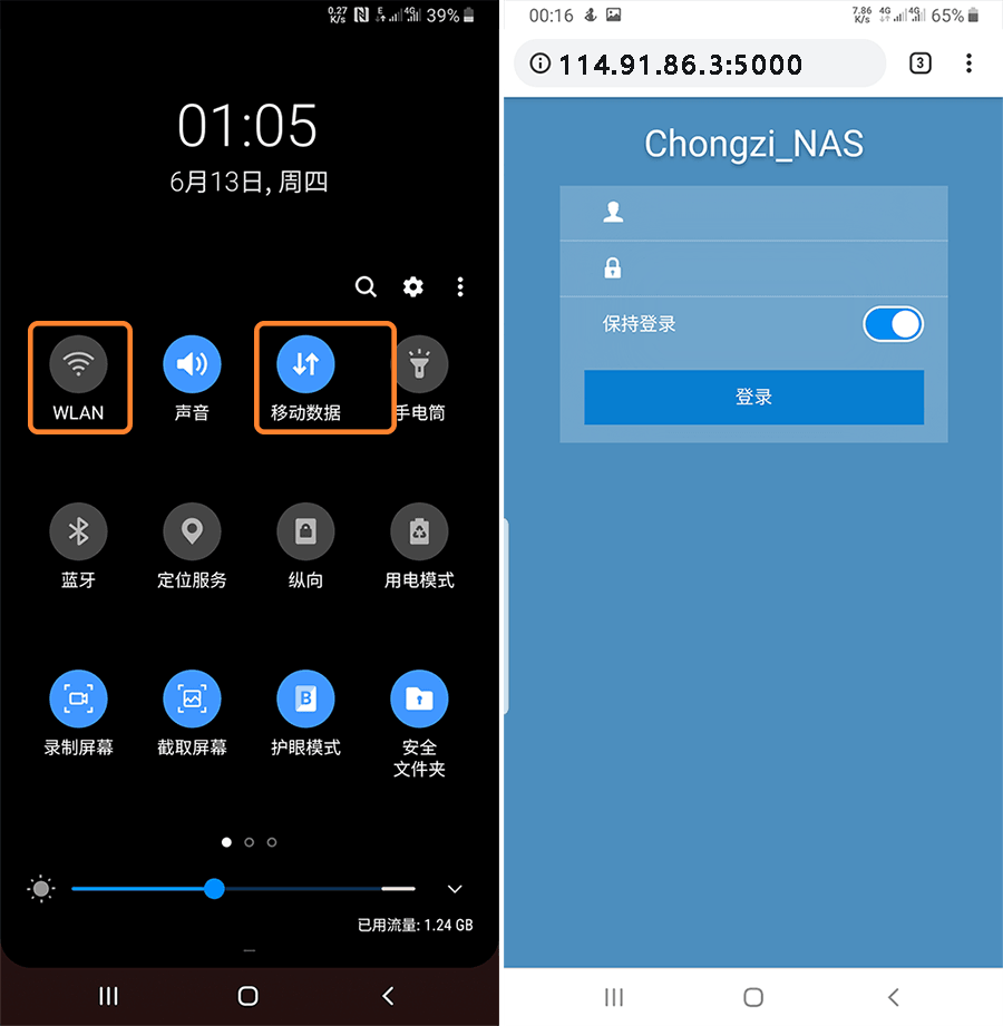 先断开手机WiFi再连接4G网络(WIFI是内网会冲突),在浏览器输入公网IP:5000(本例为114.91.86.3:5000)顺利进入群晖NAS桌面。
